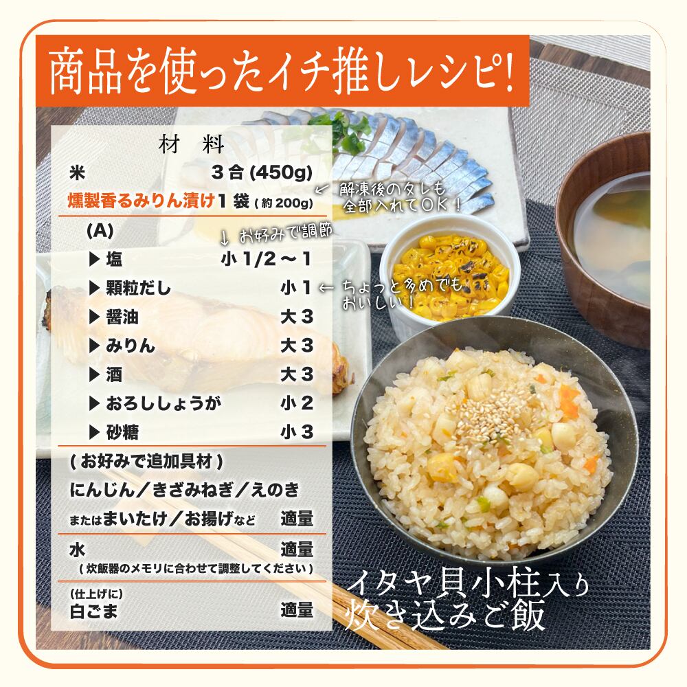 ベビーホタテのような小ぶりで ホタテの貝柱にそっくりなこの商品。実はホタテではありません。 「イタヤ貝(板屋貝)」といいます。 始めて聞いたという方もいらっしゃると思うので簡単にですがご紹介いたします。 イタヤ貝は日本国内で古くから存在していた貝で 貝殻の見た目も帆立にとっても似ています。 味に関しては概ね美味しいと評判で ほたてと比べややあっさりとしていて 濃厚!という程ではありませんが シンプルに貝の旨味や甘味を感じられる美味しい貝です。 獲れたての貝ならばお刺身はもちろん 茹で・寿司ネタ・焼き物・フライ・煮物と調理バリエーションも豊かなのですが 帆立に比べてひと回り~ふた回りほどサイズが小さいため1つあたりの可食部が少ないうえ すごく獲れる年もあれば全然獲れない年もあるとのことで 安定して食卓に並ぶほどの流通量がないのだそうです。 今回のイタヤ貝は中国で水揚げされた物を鮮度が良いまま小柱を取り出しボイル加工をして旨味をギュっと閉じ込めた物を使用しています! 社内で検食を重ねたところ 長めに加熱しても身が固くなりにくく程よい食感の食べやすい貝柱だと感じ 自社の工場にて特製の漬魚ならぬ「漬貝」を作成してみました。 実はこのイタヤ貝の小柱はボイルをすることで 料理の素材として使用した場合に味が入りやすく 加熱調理にとても向いているんです。 フライパン1つで手軽に調理できる加熱用食材として おかずとしてあと1品プラスできる適量サイズ(約200g)でのご提供となります。 大手販売会社の冷凍シーフードミックス原料や海鮮かき揚げの具材などにも利用されてるイタヤ貝の小柱。 特製タレにじっくりと漬け込んで使いやすい小分けパックにした状態でお届けいたします。 今回は ・燻製香るみりん漬け ・やみつきバジルオリーブ ・海鮮西京風味噌漬け ・プレーン 「燻製香るみりん漬け」は ひと口入れた瞬間にふんわりと広がるスモークのフレーバーが鼻孔をくすぐり 小柱をひと噛みすると貝の旨味に溶け込んだ絶妙なみりんの甘辛ダレがより一層の美味しさを際立たせます。 食卓のおかずにもオススメですが 特にお酒を飲まれる方には酒の肴・おつまみとしても食欲そそる一品です! 「バジルオリーブ漬け」は 当店海マルシェちくまるを運営している千倉水産加工販売株式会社が大手宅配商品向けとして製造している大人気商品 「サーモンバジルオリーブ」に使用している特製ブレンドをベースにイタヤ貝用へブラッシュアップしました。 美味しさのためには一切妥協をしない 厳選された香り高いオリーブオイルに風味豊かな芳醇なバジルと食欲増大のアクセントとして加えたガーリック&ホワイトペッパーの旨味が幾重にも重なり 食卓に並ぶおかずとしてこの上ない満足感を演出いたします。 「西京風味噌漬け」は ほんのりと柔らかさを感じる甘味のある濃厚な味噌と控えめに感じる塩味 そしてイタヤ貝の小柱から出る貝の旨味が三位一体となって味わえる味噌漬けです。 ついつい何度も箸が伸びてしまう程 クセになってしまう味わいに仕上がりました! じっくり弱火で火を入れると小柱にも軽く焼き目が入り 焦がし味噌の香ばしい風味が増し 食感にも変化が楽しめると思います!(焦げやすいので適度にかき混ぜ 焼き過ぎ等には十分ご注意ください) おかず単体やおつまみなどでサッと作ってそのまま召し上がっていただいても良し。 お好みで野菜などの具材と合わせで調理される場合は少量の白みそをみりんで溶いたものを一緒に加えていただくと より濃厚でお米が止まらない程の美味しい野菜炒めが完成しますので ぜひお試しください! 商品名:イタヤ貝 燻製香るみりん漬け(加熱用) 原材料名:イタヤ貝(中国)、みりん調味液(ぶどう糖果糖液糖、砂糖、醤油、みりん、魚醤、デキストリン、食塩、ゼラチン)、発酵調味液、(一部に大豆・小麦・ゼラチンを含む) 製造:国内自社工場 ────────── ▲▽▲▽▲▽▲▽▲▽ ────────── 商品名:イタヤ貝 やみつきバジルオリーブ(加熱用) 原材料名:イタヤ貝(中国)、オリーブオイル、ニンニク、こしょう、バジル 製造:国内自社工場 ────────── ▲▽▲▽▲▽▲▽▲▽ ────────── 商品名:イタヤ貝 海鮮西京風味噌漬け(加熱用) 原材料名:イタヤ貝(中国)、西京漬液(味噌、砂糖、米発酵調味料、食塩、ゼラチン、香辛料)、発酵調味液(米、米こうじ、食塩)/増粘剤(加工でん粉)、(一部に大豆・ゼラチンを含む) 製造:国内自社工場 ────────── ▲▽▲▽▲▽▲▽▲▽ ────────── 内容量:各種 袋約200g入り 賞味期限:冷凍で1か月/解凍後は冷蔵保存で2日以内 必ず加熱後にお召し上がりください 保存方法:要冷凍(-18℃以下で保存してください) 販売者:海マルシェちくまる(千倉水産加工販売株式会社) 千葉県船橋市浜町3-1-2